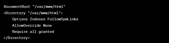 위 설정은 /var/www/html이 DocumentRoot로 설정되어 있음을 보여주며, 해당 디렉토리에 대한 접근 권한을 부여하는 방법도 보여줍니다.